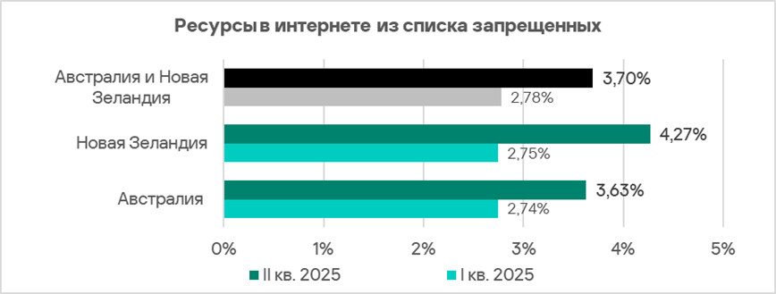 По доле компьютеров АСУ, на которых блокируются ресурсы в интернете из списка запрещенных, Австралия и Новая Зеландия занимают предпоследнее место с 3,70%. Однако по росту этого показателя регион находится на шестом месте — за квартал значение выросло в 1,3 раза.