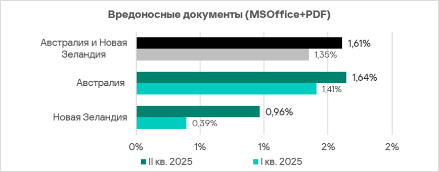 Австралия и Новая Зеландия занимают восьмое место в рейтинге регионов по доле компьютеров АСУ, на которых блокируются вредоносные документы. Показатель в регионе — 1,61% — в 2,5 раза больше, чем в Северной Европе, которая замыкает соответствующий рейтинг.