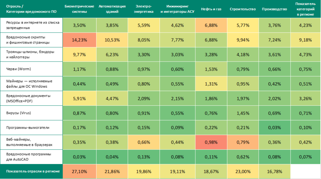 - Лидер среди отраслей в регионе по показателям следующих категорий угроз: вредоносные скрипты и фишинговые страницы, шпионские программы, вредоносные документы.