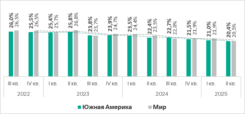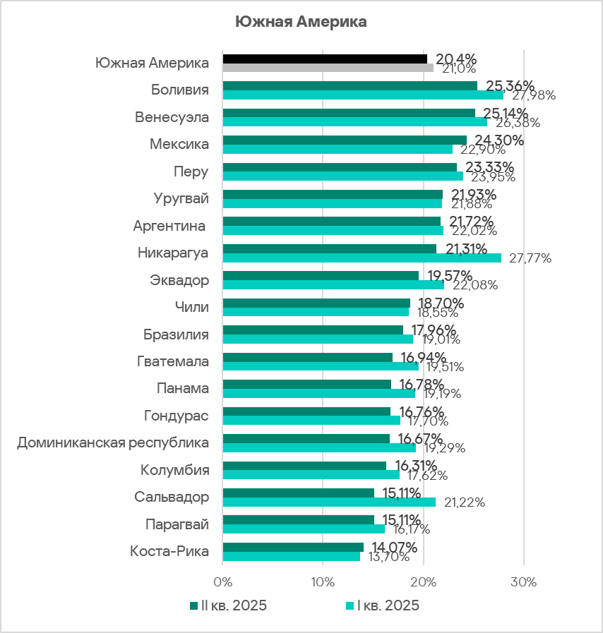 Южная Америка во втором квартале 2025 года поднялась с восьмого на пятое место в рейтинге регионов по доле компьютеров АСУ, на которых были заблокированы вредоносные объекты. Несмотря на это, показатель в регионе уменьшается третий квартал подряд. Во втором квартале 2025 года он опустился до 20,4% — это чуть ниже среднемирового значения и в 1,8 раза больше, чем в Северной Европе, где значение наименьшее из всех регионов.