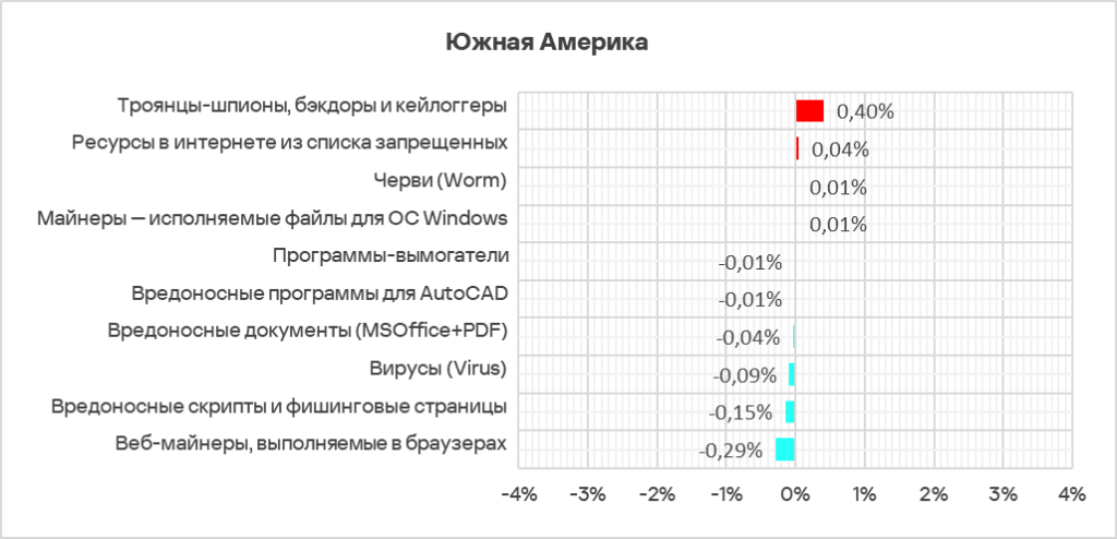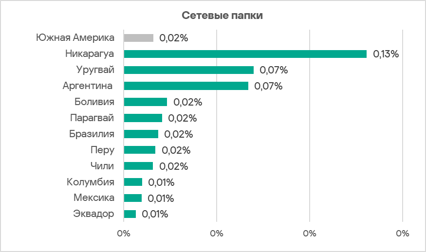 Южная Америка занимает девятое место среди регионов по доле компьютеров АСУ, на которых угрозы блокируются в сетевых папках, с 0,02%. С Северной Европой, которая занимает последнее место в рейтинге, показатели отличаются в 1,6 раза.