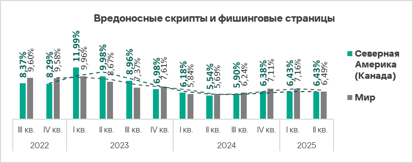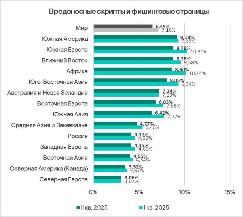 Во втором квартале 2025 года доля компьютеров АСУ, на которых блокируются вредоносные скрипты и фишинговые страницы, уменьшилась во всех регионах, кроме двух — Северной Америки (Канады) и Австралии и Новой Зеландии.