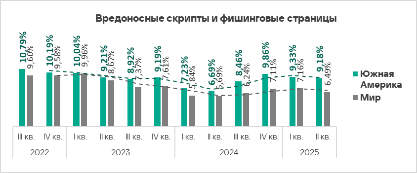 По доле компьютеров АСУ, на которых блокируются вредоносные скрипты и фишинговые страницы, Южная Америка лидирует среди регионов с показателем, который в 1,4 раза больше среднемирового.