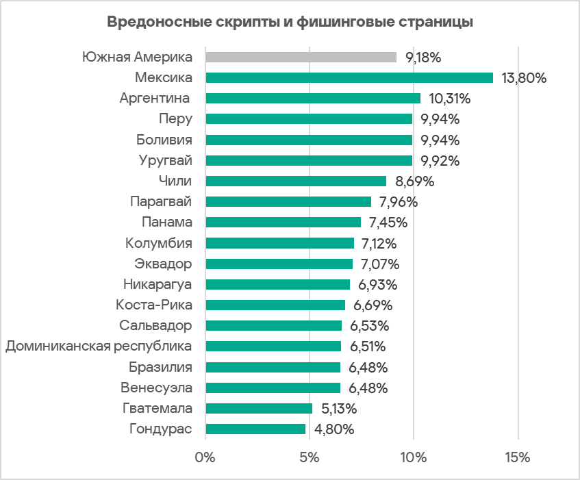 Среди стран региона по доле компьютеров АСУ, на которых были заблокированы вредоносные скрипты и фишинговые страницы, лидирует Мексика с 13,80%. Наименьший показатель в Гондурасе — 4,80%.