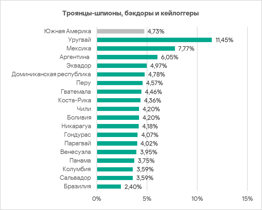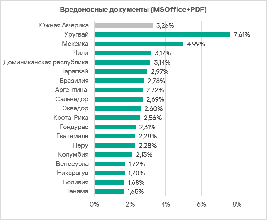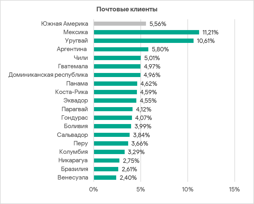 Среди стран региона по доле компьютеров АСУ, на которых были заблокированы угрозы из почтовых клиентов, с отрывом лидируют Мексика с 11,21% и Уругвай с 10,61%. Показатели остальных стран варьируют от 2,40% в Венесуэле до 5,80% в Аргентине.