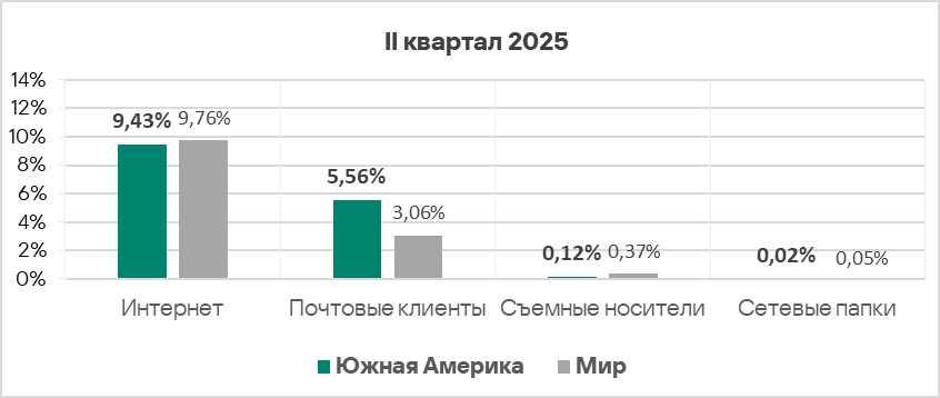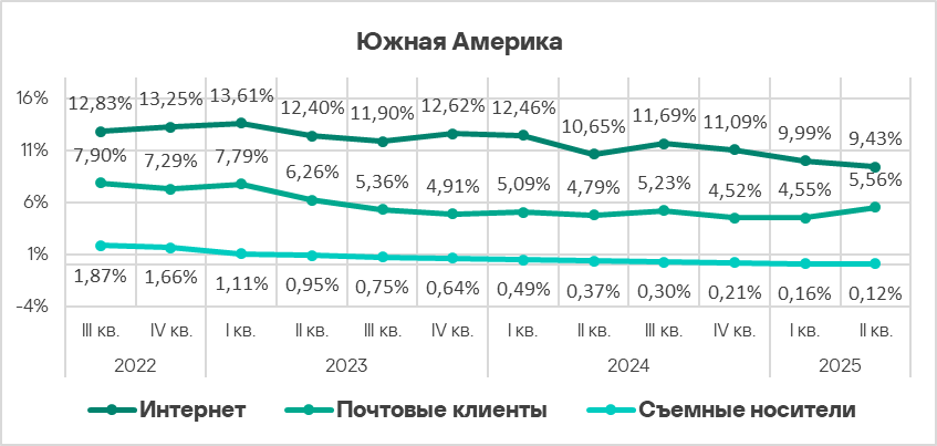 Показатели всех источников угроз, кроме почтовых клиентов, в Южной Америке ниже среднемировых.