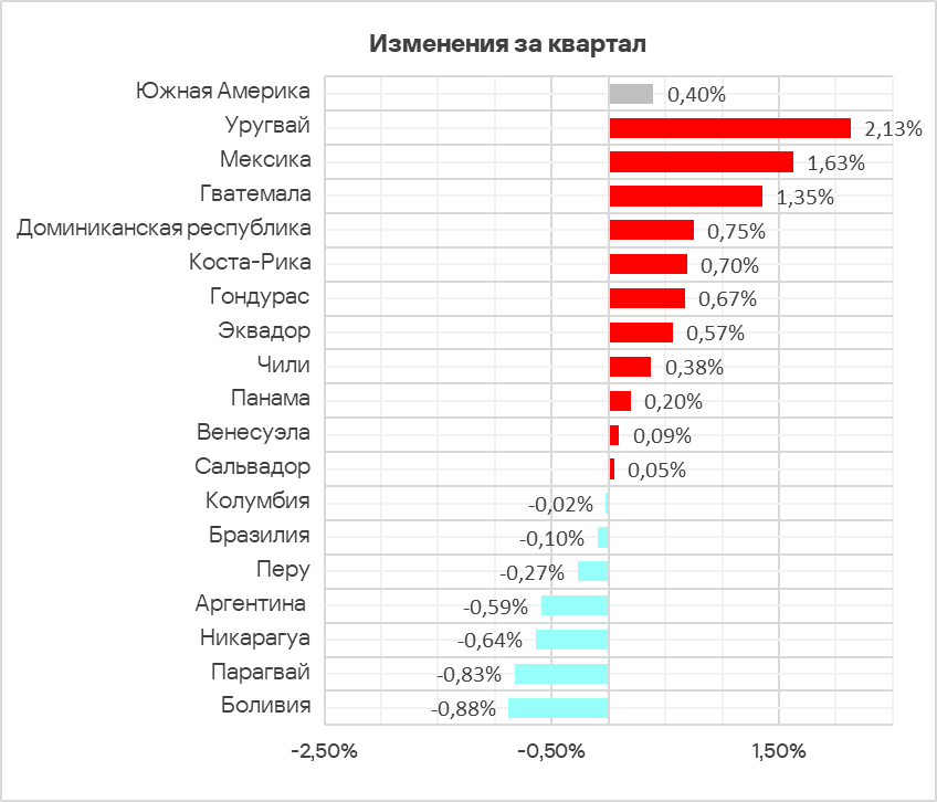 Во втором квартале 2025 года доля компьютеров АСУ, на которых блокируются шпионские программы, выросла только в двух регионах, и Южная Америка лидирует по росту этого показателя. Среди стран региона больше всего показатель вырос в Уругвае, Мексике и Гватемале.