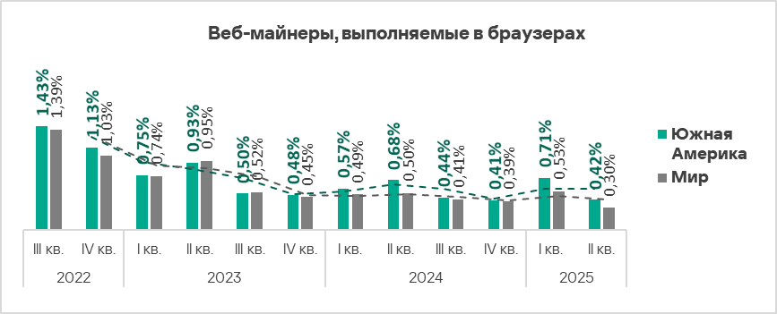 Показатель веб-майнеров в регионе с третьего квартала 2023 года колеблется в диапазоне от 0,41% до 0,71%.