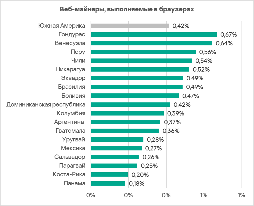 Среди стран региона по доле компьютеров АСУ, на которых блокируются веб-майнеры, лидирует Гондурас с 0,67%. Наименьший показатель в Панаме — 0,18%.