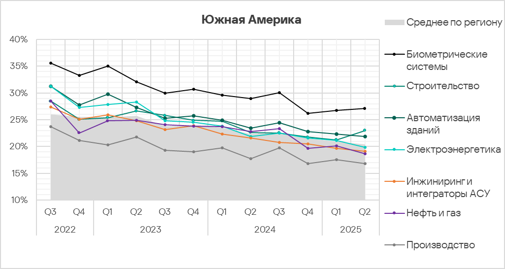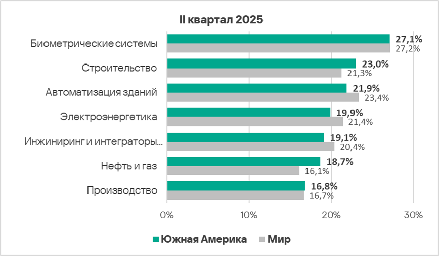Показатели источников угроз в отраслях в Южной Америке, II квартал 2025 года