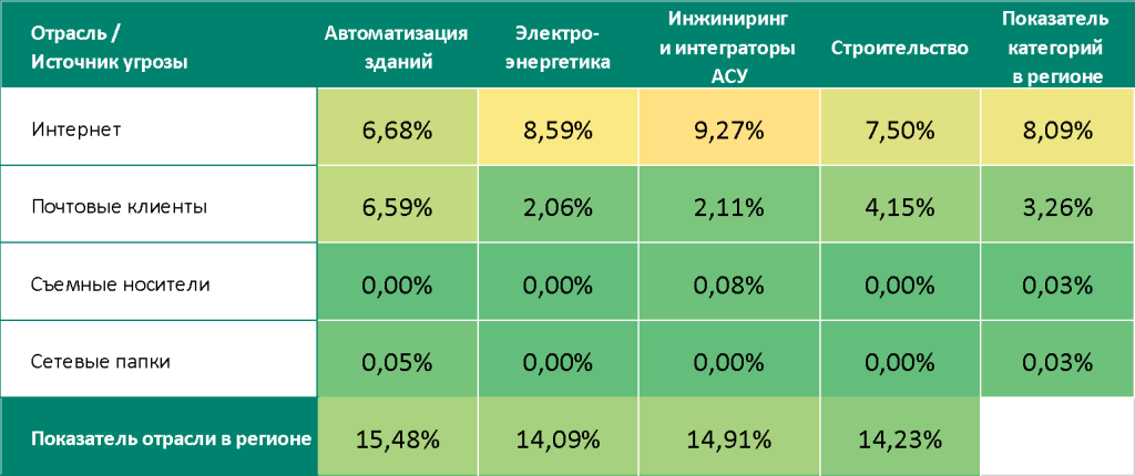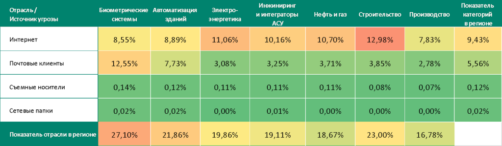 - Третье место в регионе среди отраслей по показателю угроз из интернета. Четвертое место по показателю угроз в почтовых клиентах и на съемных носителях.