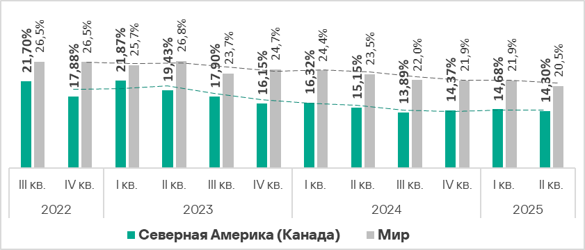 Показатели источников угроз в отраслях в Северной Америке (Канаде), II квартал 2025 года