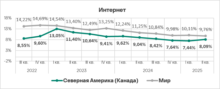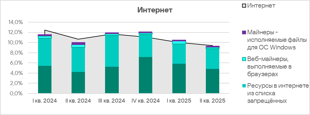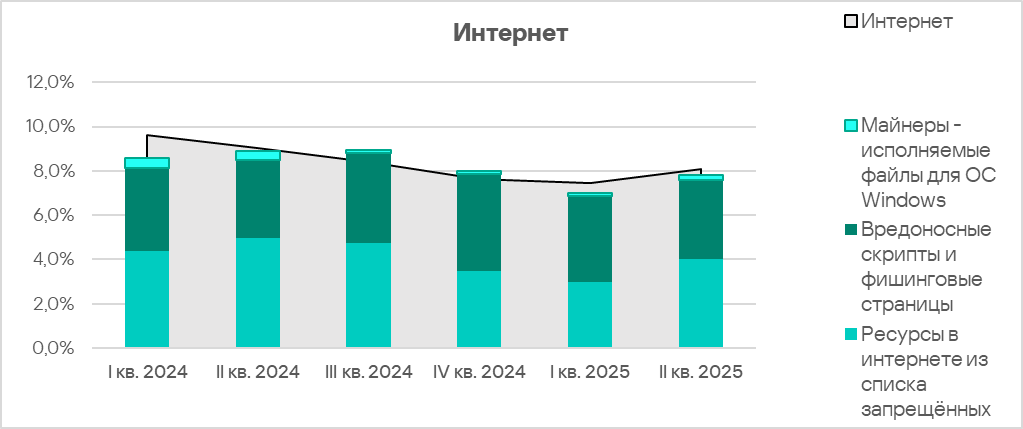 Во втором квартале 2025 доля интернет-угроз в регионе выросла, на фоне снижения среднемирового показателя, завершив последовательное снижение в течении предыдущих четырех кварталов.
