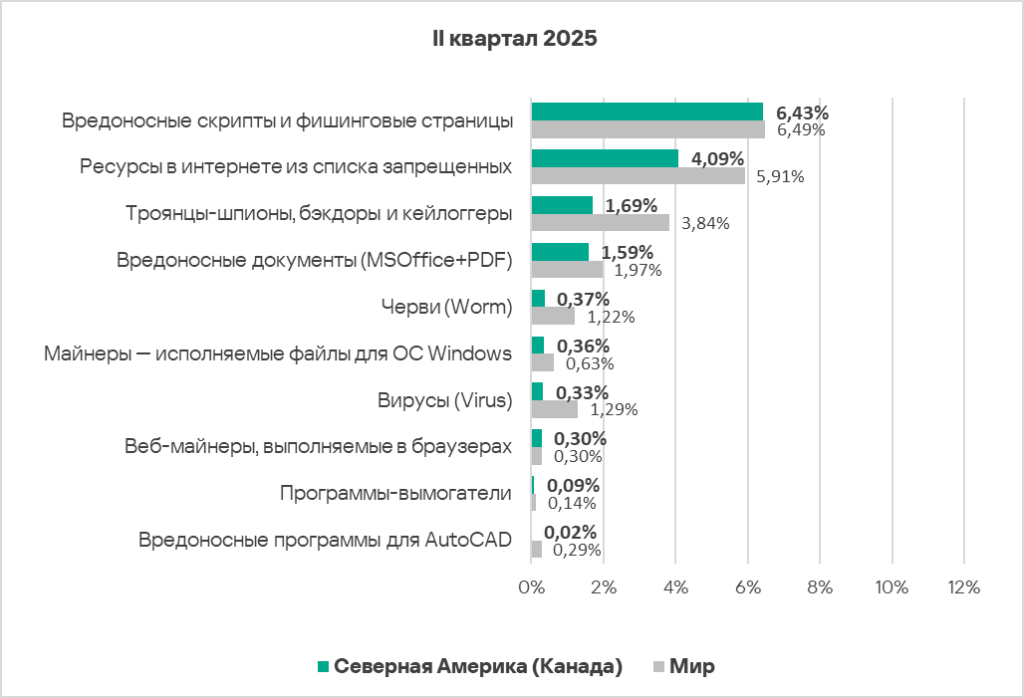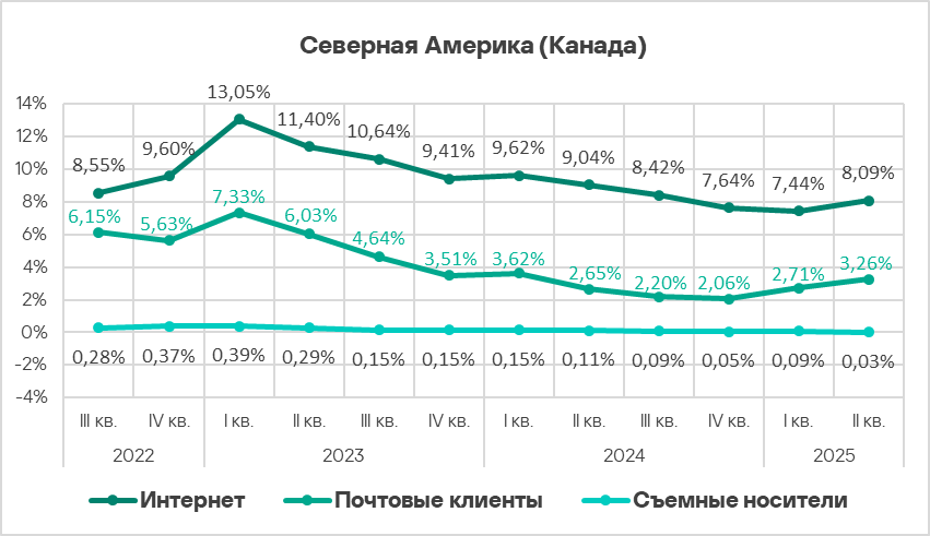 Во втором квартале 2025 года из всех источников угроз доля компьютеров АСУ, на которых были заблокированы вредоносные объекты, увеличилась у интернета и почтовых клиентов. По росту показателя угроз из интернета Северная Америка (Канада) находится на втором месте среди регионов.