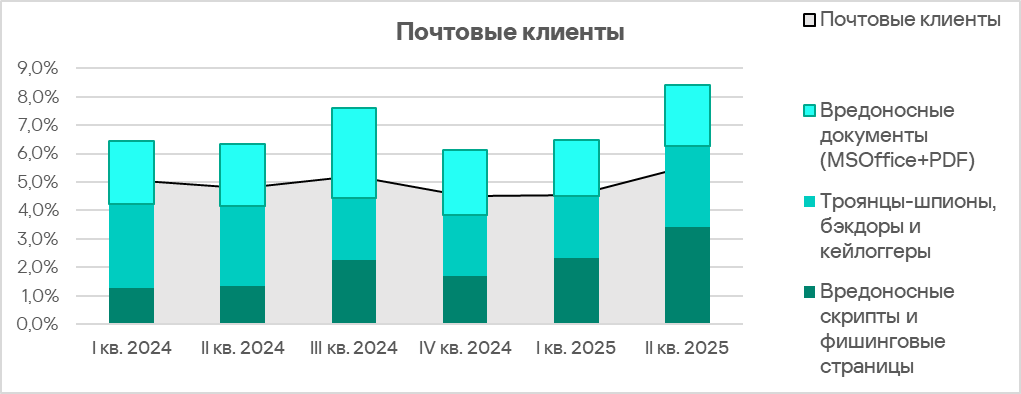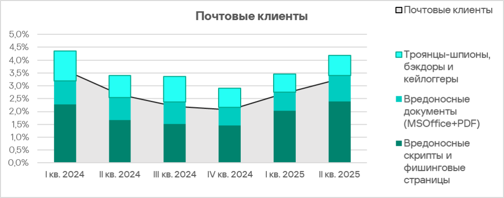 Во втором квартале 2025 года из всех источников угроз доля компьютеров АСУ, на которых были заблокированы вредоносные объекты, увеличилась только у почтовых клиентов.