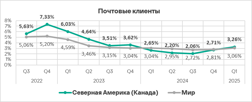Во втором квартале 2025 года доля компьютеров АСУ, на которых были заблокированы угрозы из почтовых клиентов, выросла во всех регионах, кроме России. По росту этого показателя также лидирует Южная Америка.
