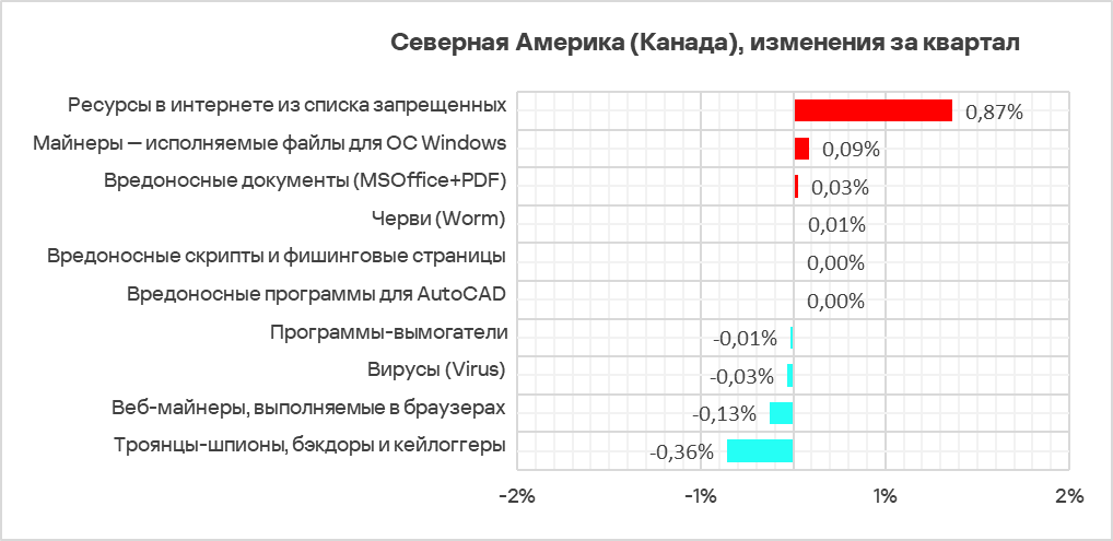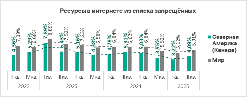 По доле компьютеров АСУ, на которых блокируются ресурсы в интернете из списка запрещенных, Северная Америка (Канада) занимает третье с конца место в соответствующем рейтинге регионов с 4,09%. Однако по росту этого показателя регион оказался на седьмом месте — за квартал значение выросло в 1,3 раза.