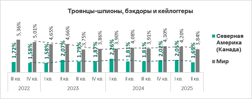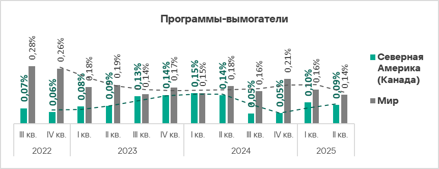 Северная Америка (Канада) — второй из четырех регионов по росту доли компьютеров во втором квартале 2025 года, на которых блокировались майнеры — исполняемые файлы, в то время как в большинстве регионов доля этой категории угроз снизилась.