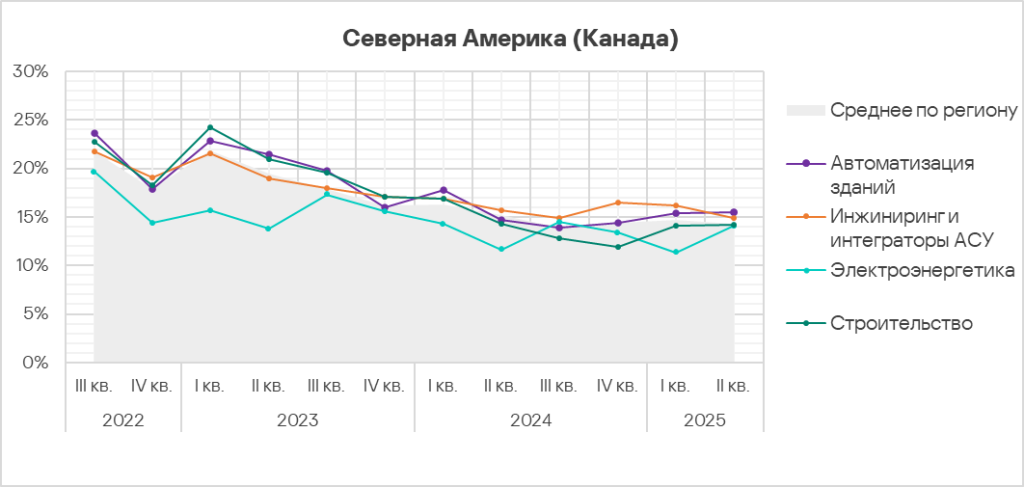 Показатели категорий угроз в отраслях в Северной Америке (Канаде), II квартал 2025 года