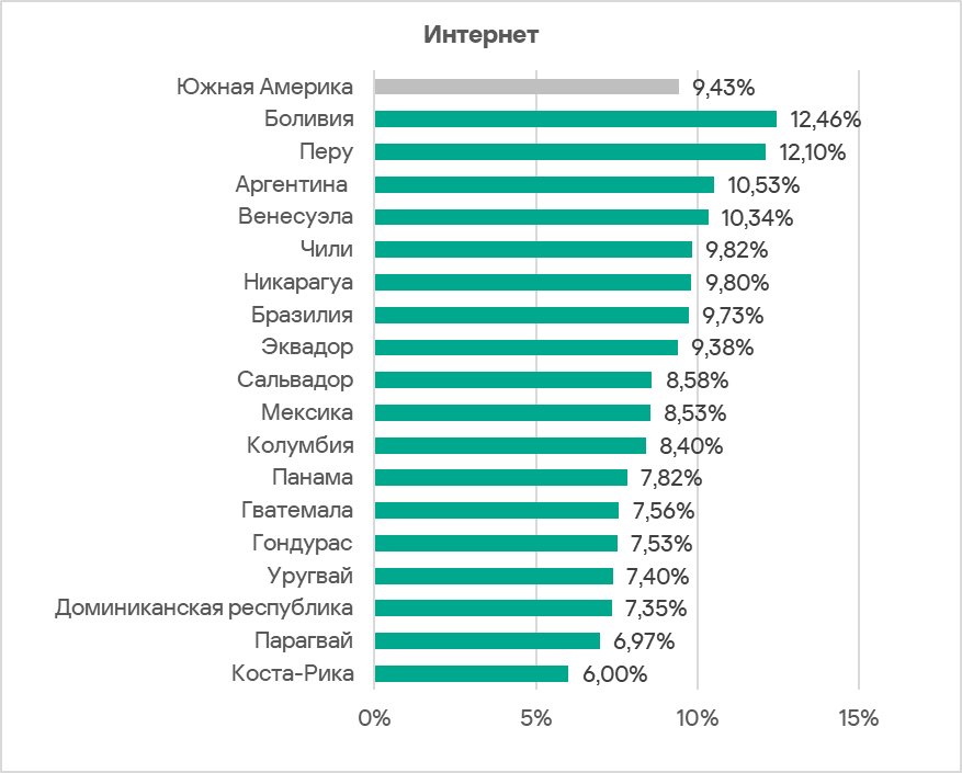 По доле компьютеров АСУ, на которых были заблокированы угрозы из интернета, Южная Америка занимает шестое место в рейтинге регионов с показателем, который превышает минимальный — у Восточной Азии — в 1,5 раза.