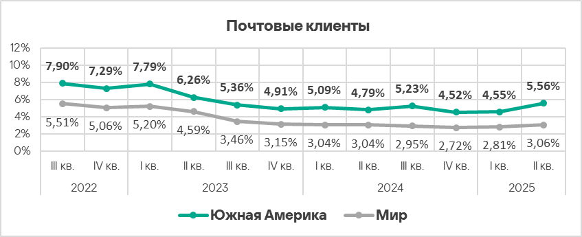 По доле компьютеров АСУ, на которых были заблокированы угрозы из почтовых клиентов, во втором квартале 2025 года Южная Америка занимает второе место среди регионов, уступая только Южной Европе. Показатель Южной Америки в 7 раз выше, чем в России, которая замыкает этот рейтинг.