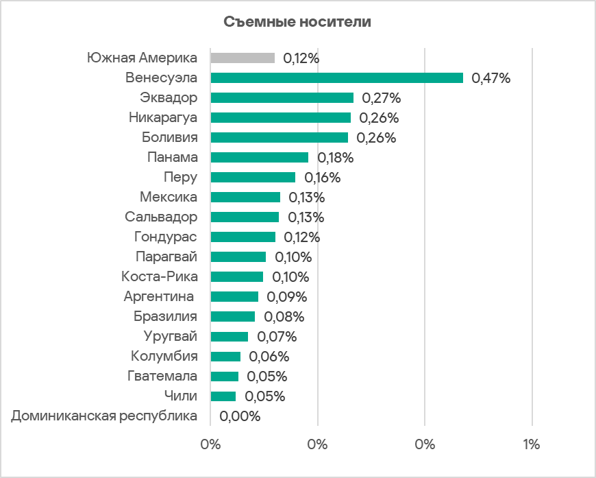 Среди стран региона по доле компьютеров АСУ, на которых были заблокированы угрозы при подключении съемных носителей, с большим отрывом лидирует Венесуэла с 0,47%.