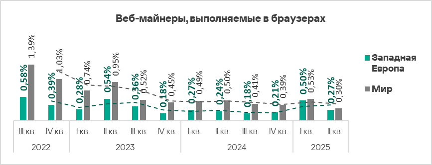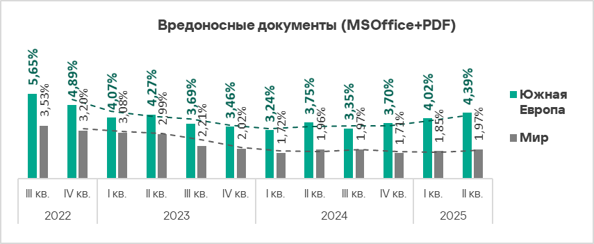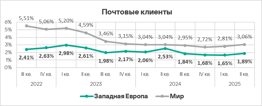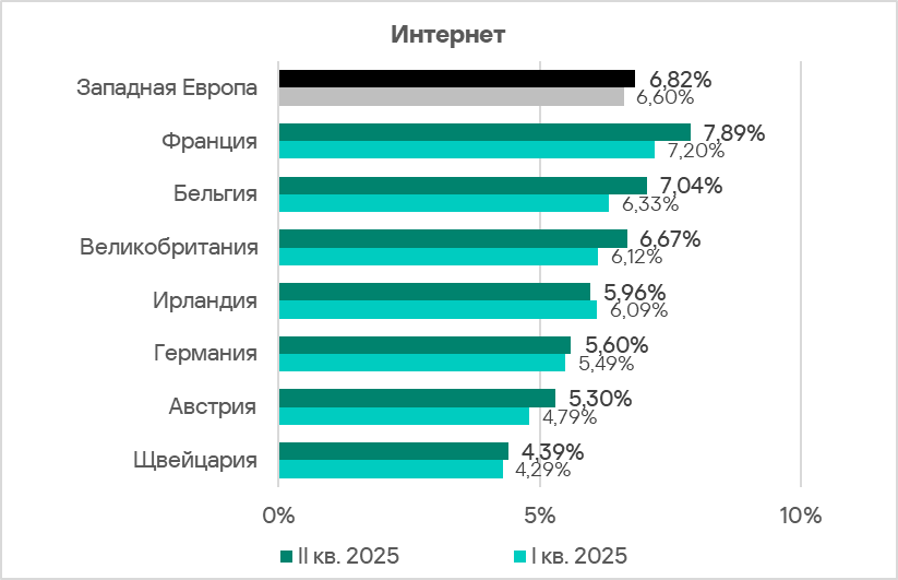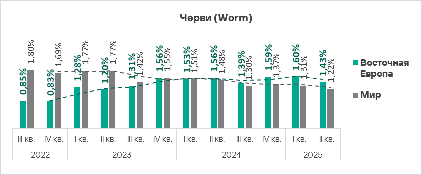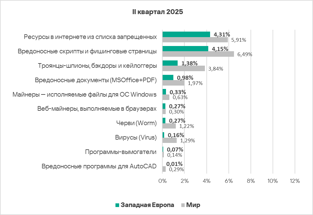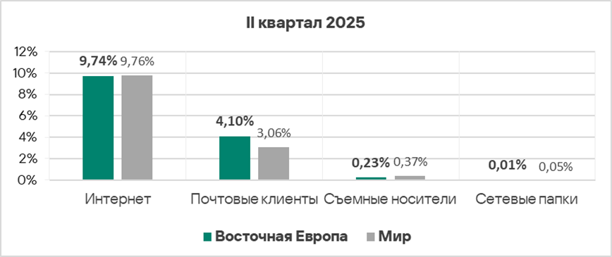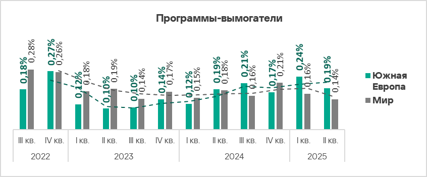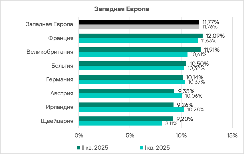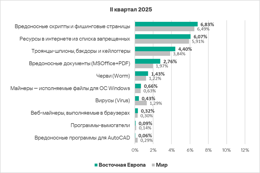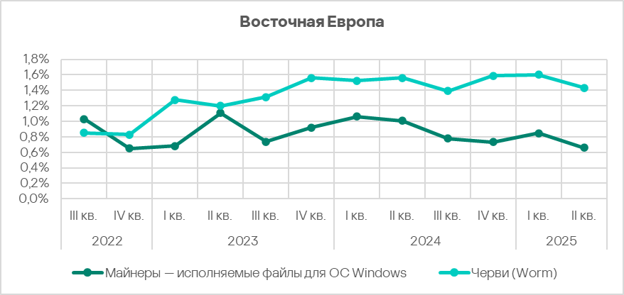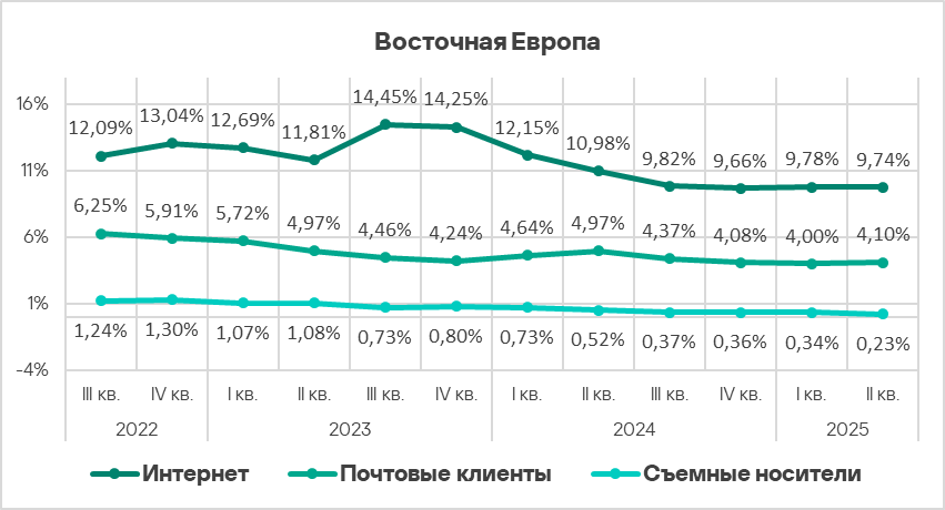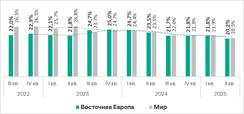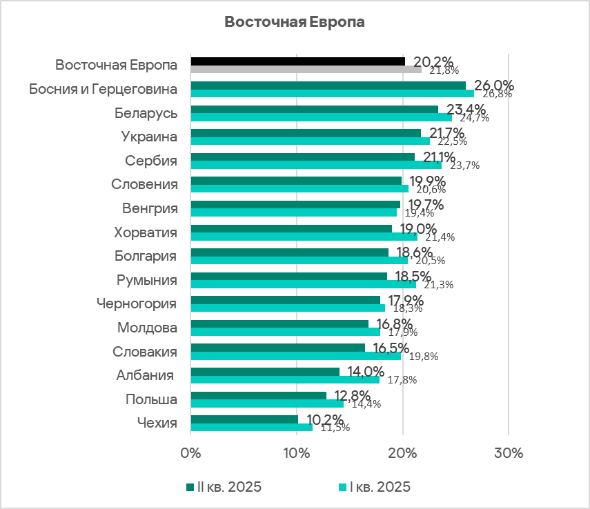Во втором квартале 2025 года Восточная Европа заняла шестое место в рейтинге регионов по доле компьютеров АСУ, на которых были заблокированы вредоносные объекты. Это самая высокая позиция среди регионов Европы. До второго квартала 2023 года регион не поднимался в рейтинге выше девятого места.