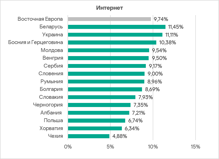По доле компьютеров АСУ, на которых были заблокированы угрозы из интернета, Восточная Европа занимает пятое место в рейтинге регионов с показателем 9,74%, который превышает минимальный — у Восточной Азии — в 1,5 раза.