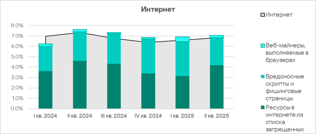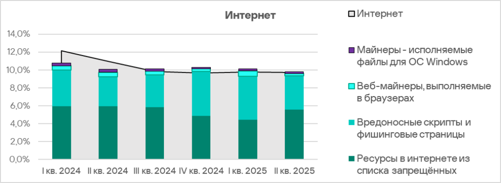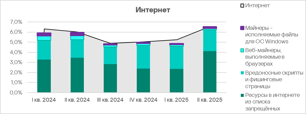 Основные категории угроз из интернета, блокируемые на компьютерах АСУ в регионе, — это ресурсы в интернете из списка запрещенных, вредоносные скрипты и фишинговые страницы, майнеры обеих категорий.