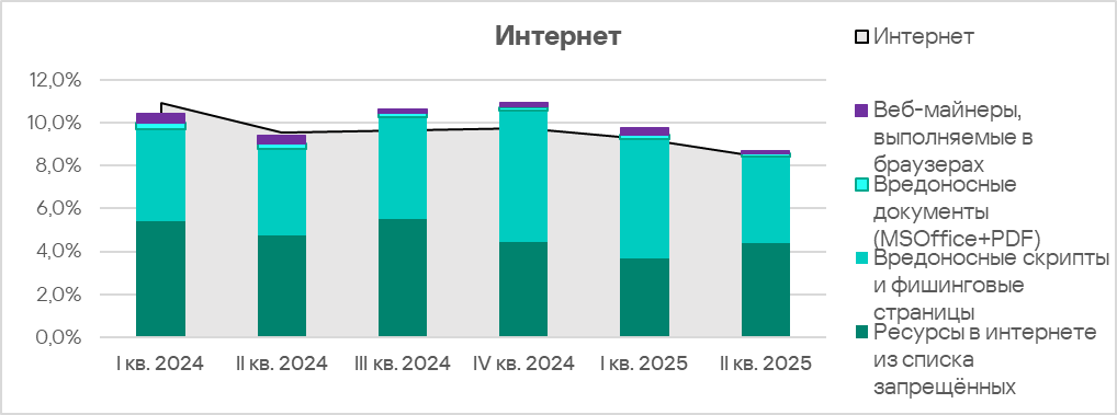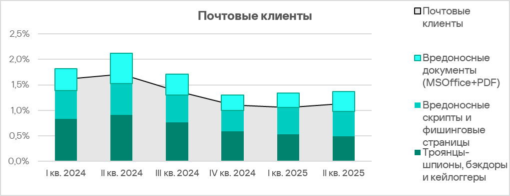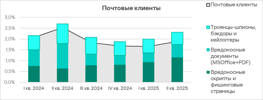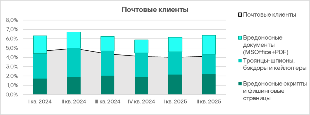 Во втором квартале 2025 года из всех источников угроз доля компьютеров АСУ, на которых были заблокированы вредоносные объекты, немного увеличилась только у почтовых клиентов.