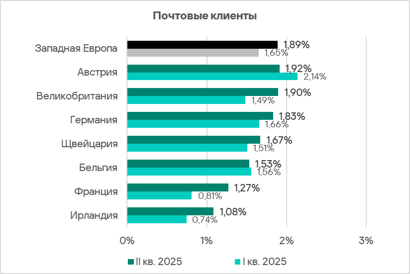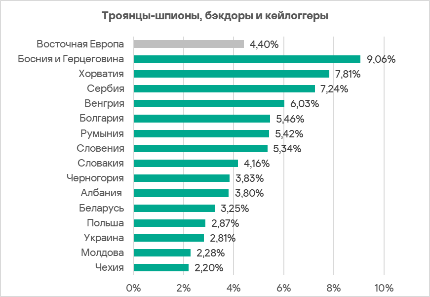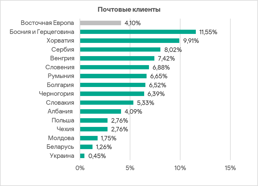 Среди стран региона по доле компьютеров АСУ, на которых были заблокированы угрозы из почтовых клиентов, лидирует Босния и Герцеговина с 11,55%. Наименьший показатель — в Украине (0,45%).