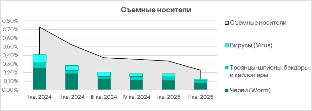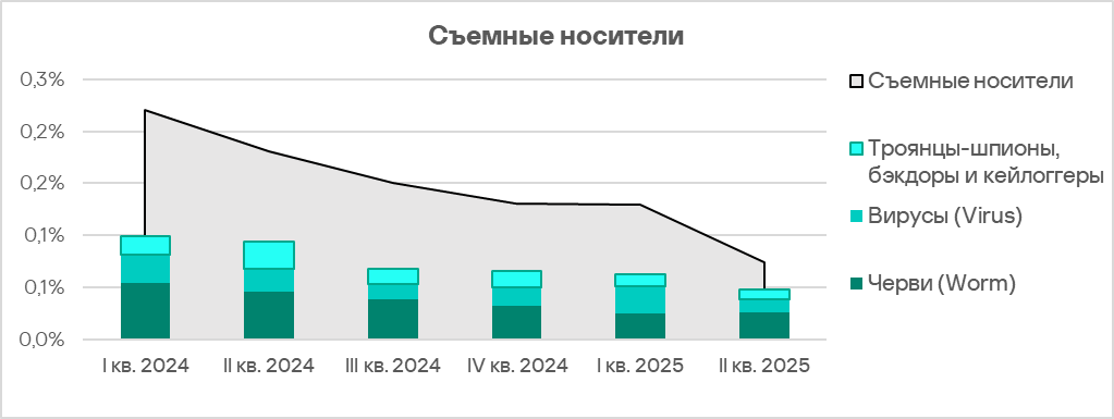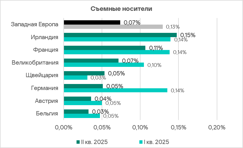 По доле компьютеров АСУ, на которых угрозы блокируются при подключении съемных носителей, во втором квартале 2025 года Восточная Европа занимает среди регионов седьмое место с 0,23%. В Северной Америке (Канада), которая занимает последнее место в рейтинге, показатель меньше в 8,6 раза.
