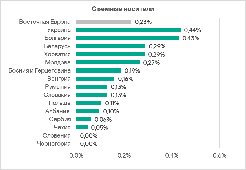 Среди стран региона по доле компьютеров АСУ, на которых были заблокированы угрозы при подключении съемных носителей, с отрывом лидируют Украина с 0,44% и Болгария с 0,43%.