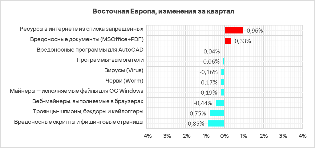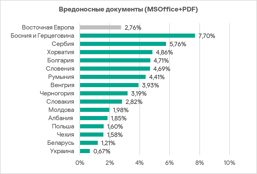 Восточная Европа занимает пятое место в рейтинге регионов по доле компьютеров АСУ, на которых блокируются вредоносные документы. Показатель в регионе — 2,76% — в 4,3 раза больше, чем в Северной Европе, которая замыкает соответствующий рейтинг.