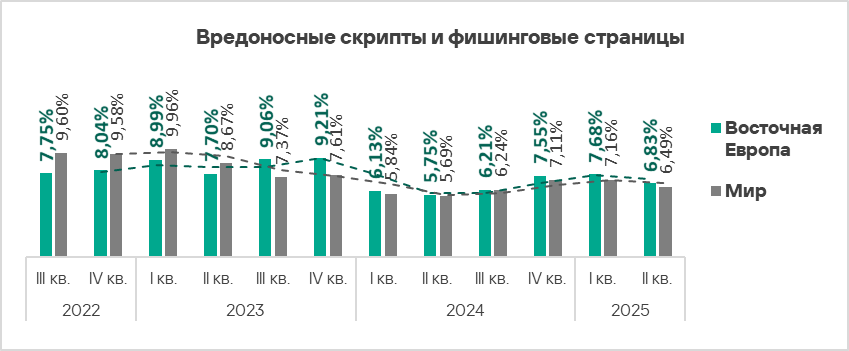 Доля компьютеров АСУ, на которых блокируются вредоносные скрипты и фишинговые страницы, в Восточной Европе в 1,1 раза выше среднемирового показателя.