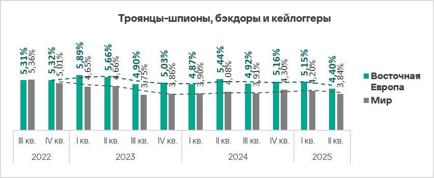Доля компьютеров АСУ, на которых блокируются шпионские программы, в Восточной Европе колеблется. Во втором квартале 2025 ода показатель был наименьшим за период с третьего квартала 2022 года.