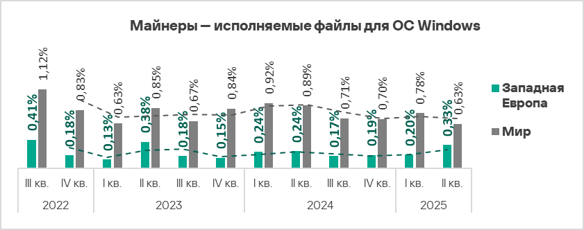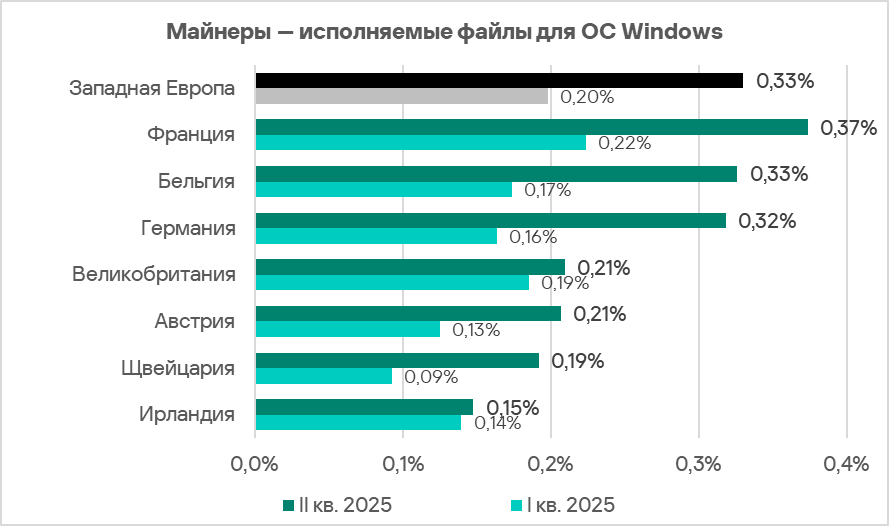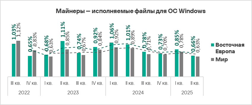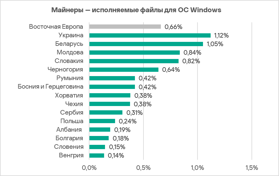 По показателю майнеров — исполняемых файлов для ОС Windows Восточная Европа находится на четвертом месте в соответствующем рейтинге с 0,65%. Этот показатель в 3,5 раза больше, чем в Восточной Азии, где значение минимальное среди регионов.