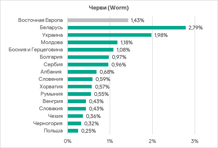 По доле компьютеров АСУ, на которых блокируются черви, Восточная Европа занимает пятое место в соответствующем рейтинге регионов с 1,43%. Это в 6,5 раза больше, чем в регионе Австралия и Новая Зеландия, который замыкает этот рейтинг.