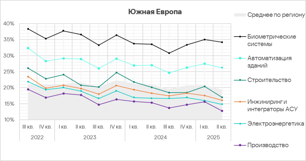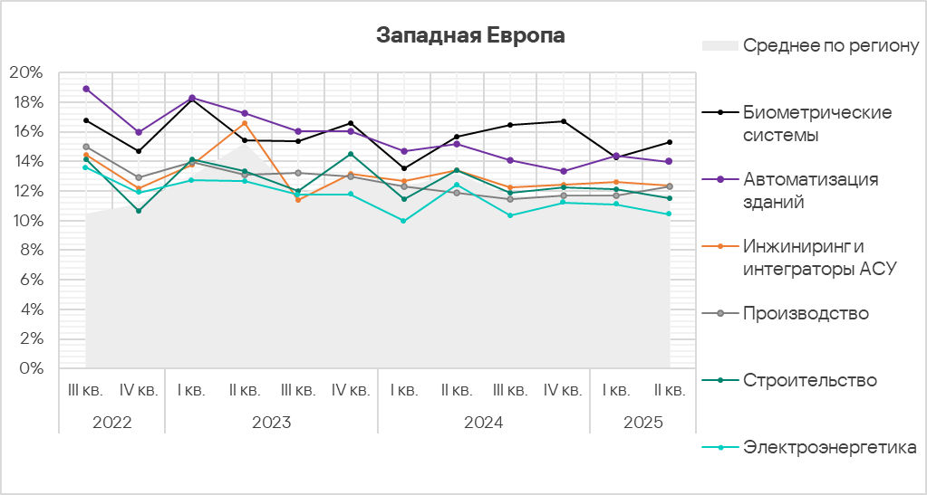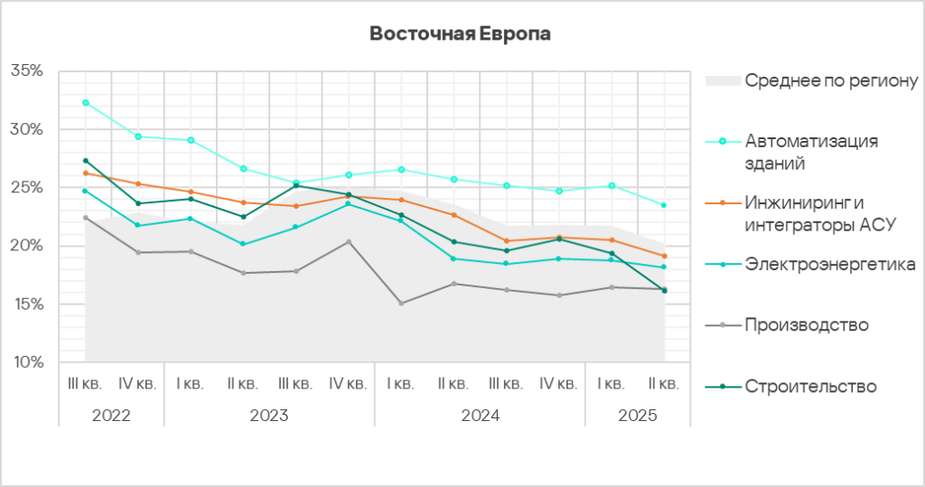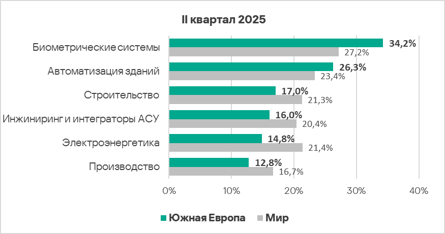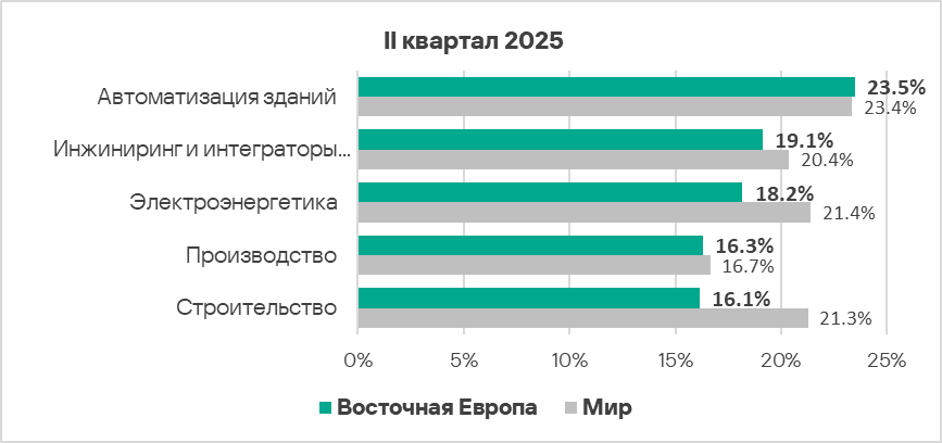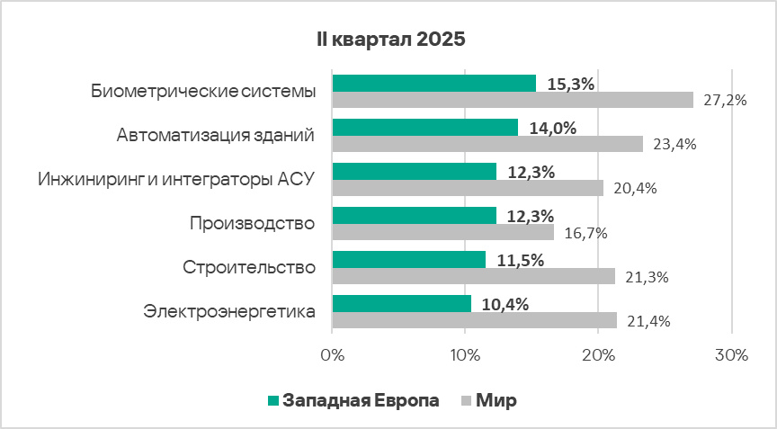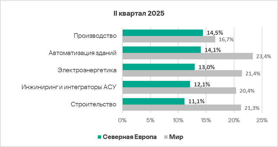 Наиболее часто встречающейся с угрозами отраслью региона из рассмотренных в отчете является автоматизация зданий. Только у этой отрасли показатель немного превышает среднемировой. И это единственная отрасль, где показатель не уменьшился во втором квартале 2025 года.