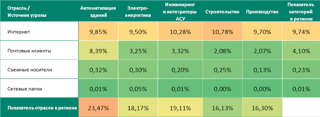 Показатели всех источников угроз, кроме почтовых клиентов, в Восточной Европе ниже среднемировых. Доля компьютеров АСУ, на которых блокируются угрозы в почтовых клиентах, в регионе в 1,3 выше среднемирового показателя.