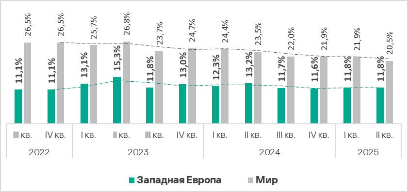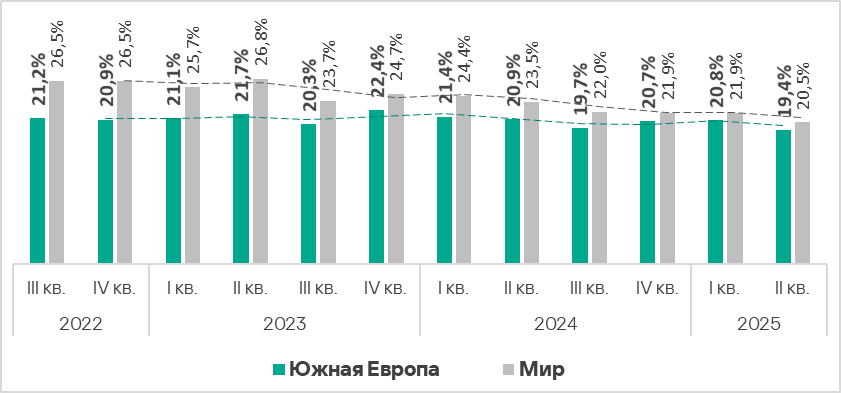Во втором квартале 2025 года показатель в регионе уменьшился до 20,2% — это немного ниже среднемирового значения и в 1,8 раза выше, чем в Северной Европе, где значение наименьшее из всех регионов.