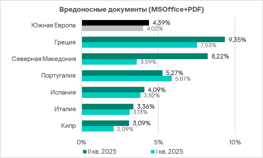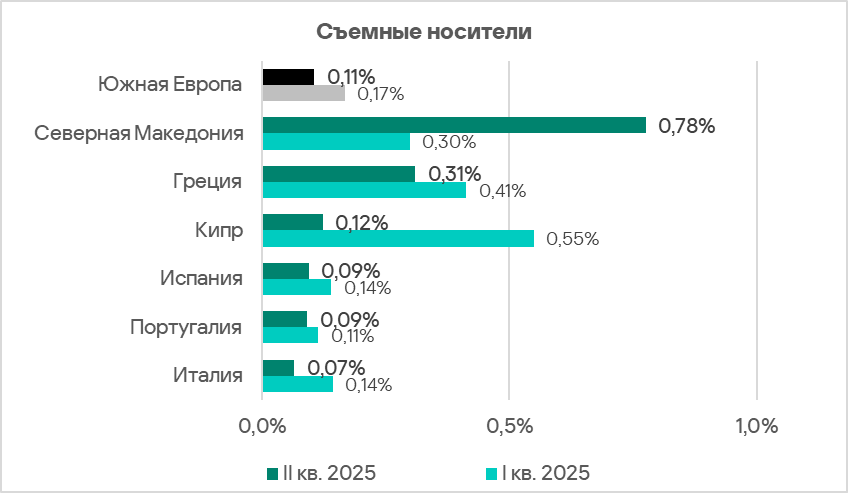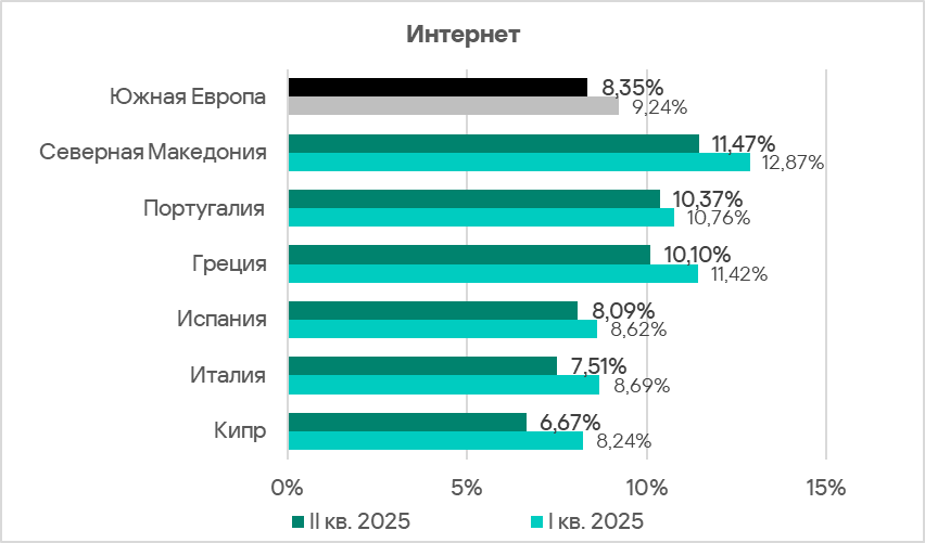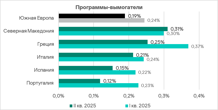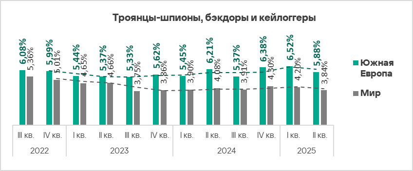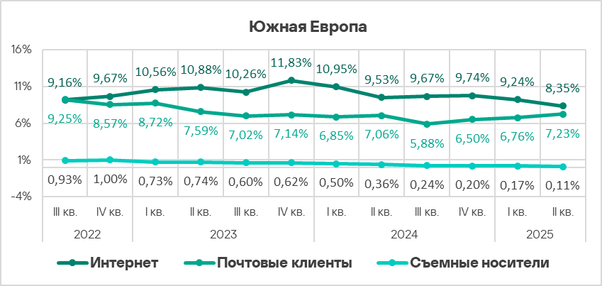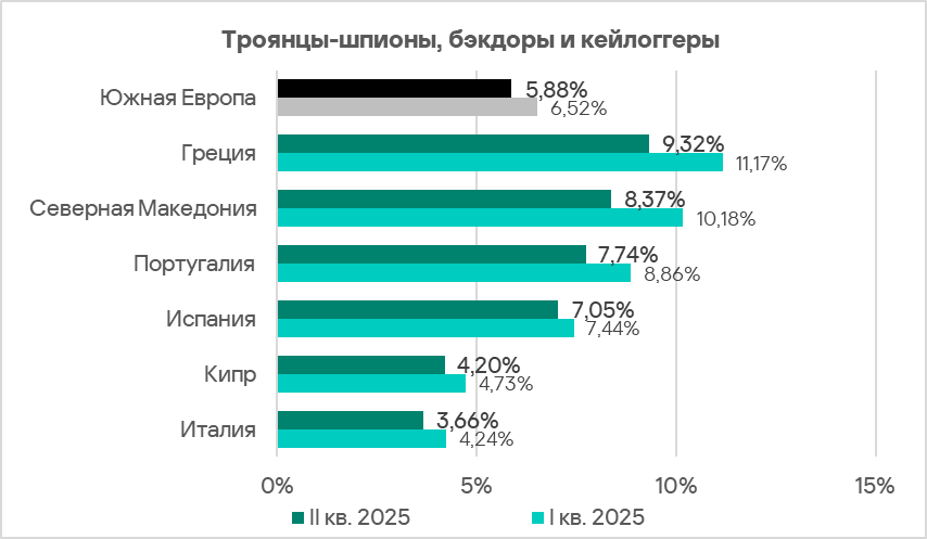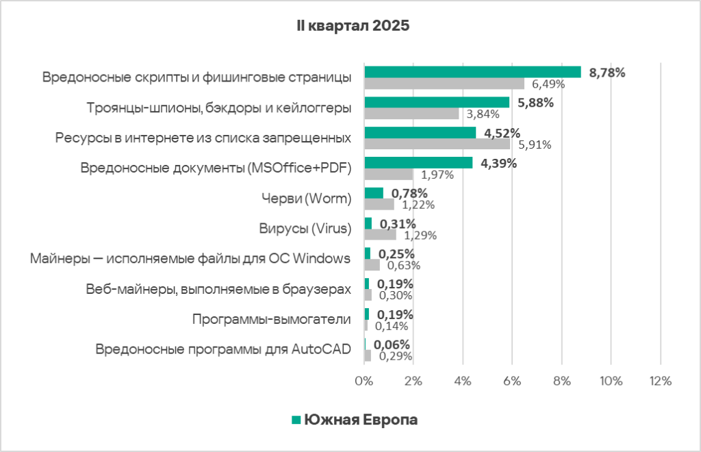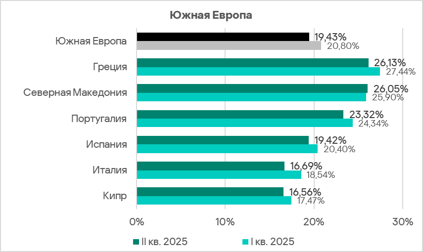 Во втором квартале 2025 года Южная Европа заняла восьмое место в рейтинге регионов по доле компьютеров АСУ, на которых были заблокированы вредоносные объекты.