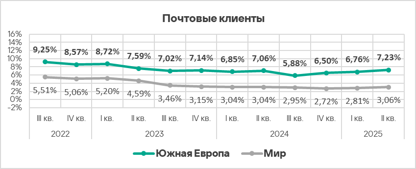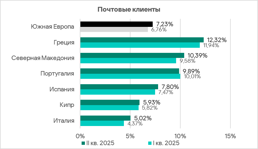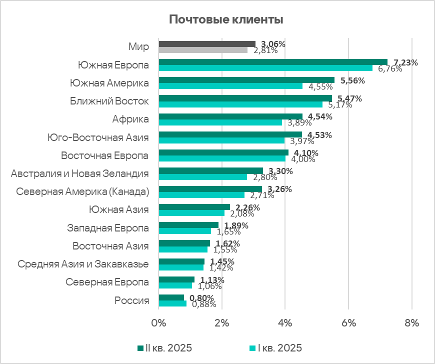 Южная Европа лидирует в рейтинге регионов по доле компьютеров АСУ, на которых были заблокированы угрозы в почтовых клиентах, с показателем, превышающим среднемировое значение в 2,4 раза.