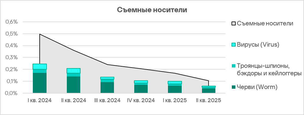 Основные категории угроз, которые блокируются при подключении съемных устройств к компьютерам АСУ: черви, шпионское ПО и вирусы.