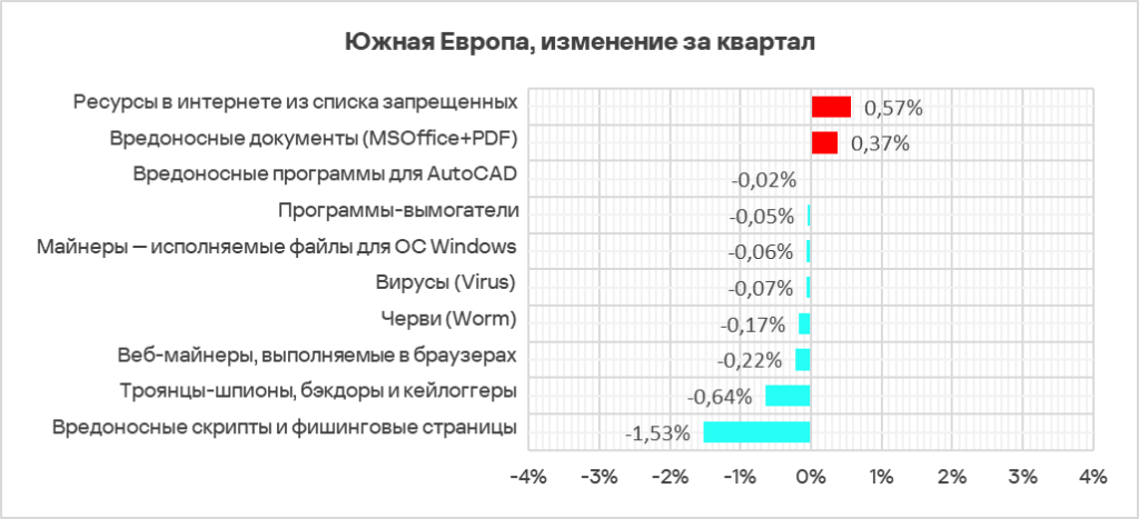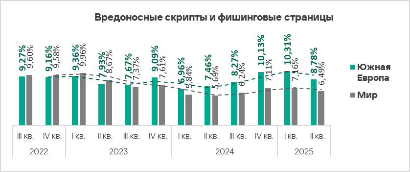 По доле компьютеров АСУ, на которых блокируются вредоносные скрипты и фишинговые страницы, Южная Европа занимает второе место в соответствующем рейтинге регионов с показателем, который в 1,4 раза выше среднемирового.