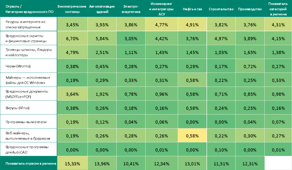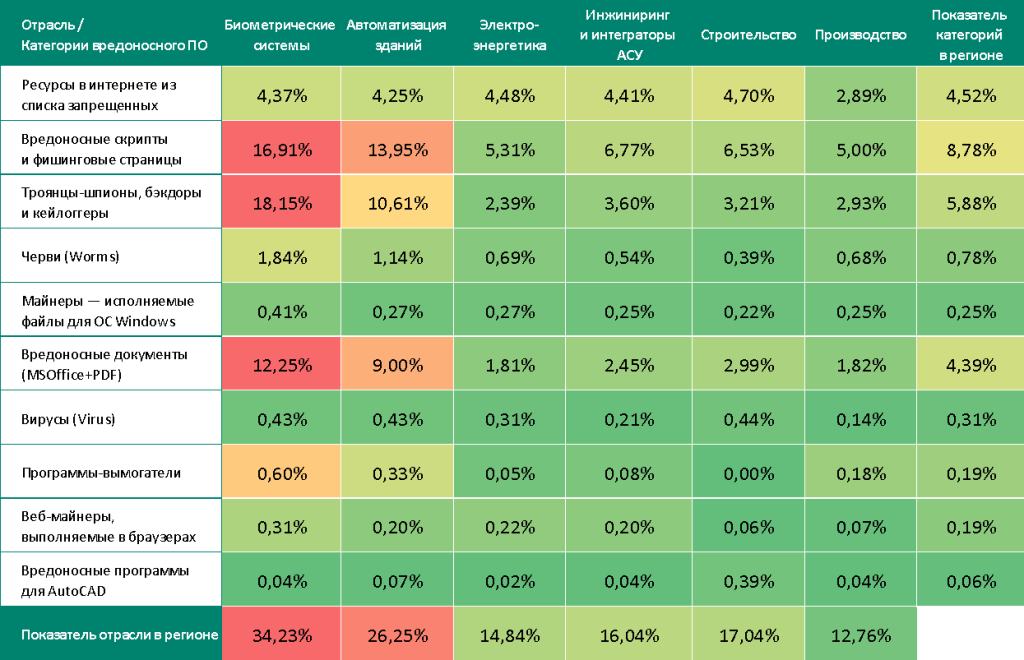 - Первое место в регионе среди отраслей по показателям следующих категорий угроз: вредоносные скрипты и фишинговые страницы, шпионские программы, вредоносные документы, программы-вымогатели.