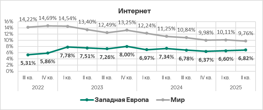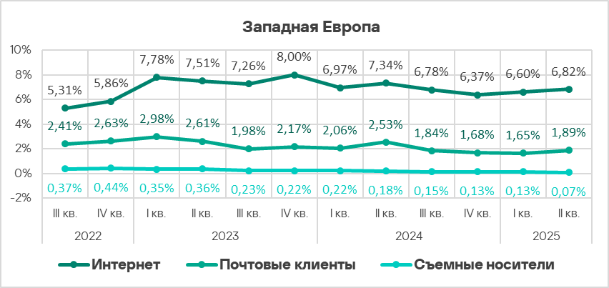 Показатели источников угроз в отраслях в Западной Европе, II квартал 2025 года