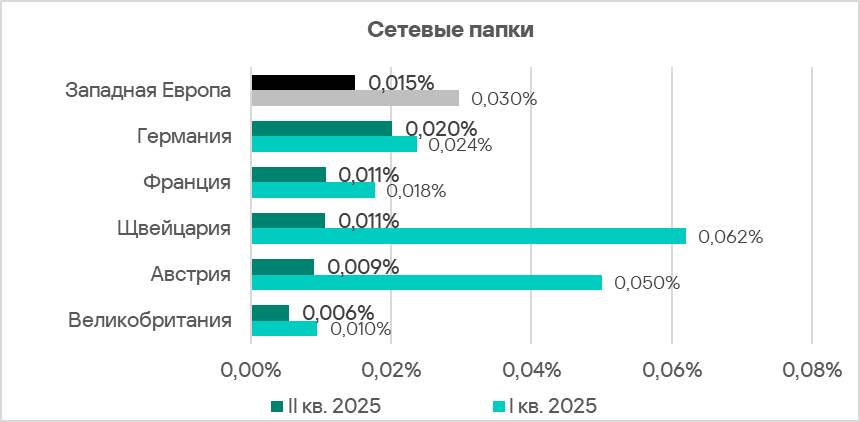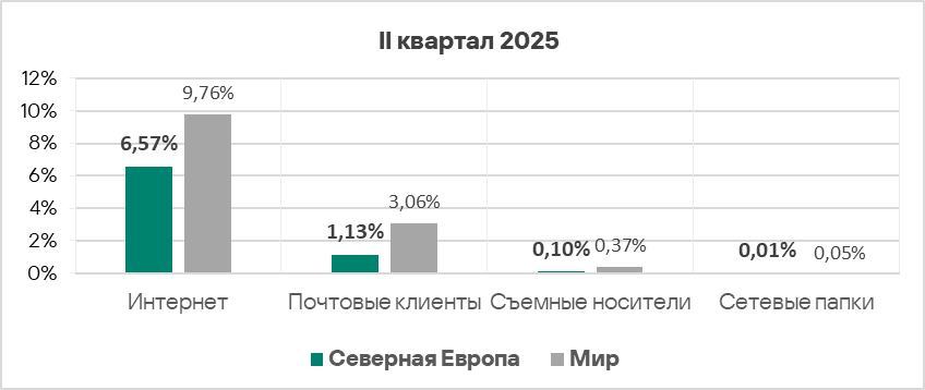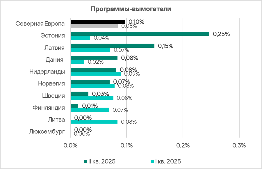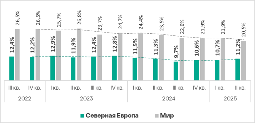 Северная Европа — один из двух регионов, где доля компьютеров АСУ, на которых блокировались вредоносные объекты, выросла во втором квартале 2025 года. Тем не менее, показатель региона — 11,2% — наименьший из всех регионов.