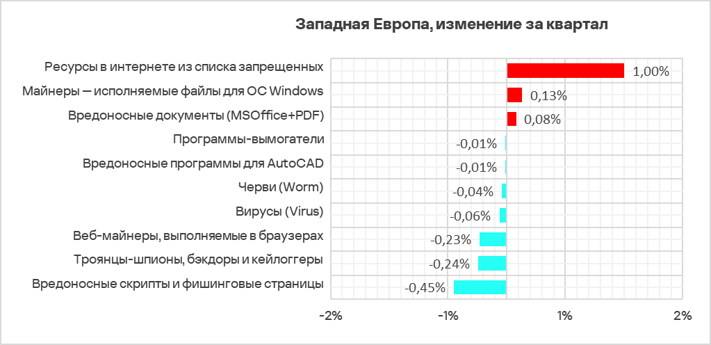По показателю категории ресурсы в интернете из списка запрещенных Восточная Европа занимает третье место в соответствующем рейтинге регионов. По показателю майнеров в формате исполняемых файлов — четвертое место среди регионов.