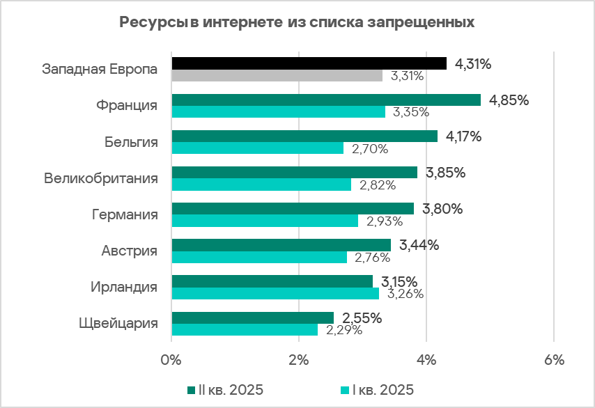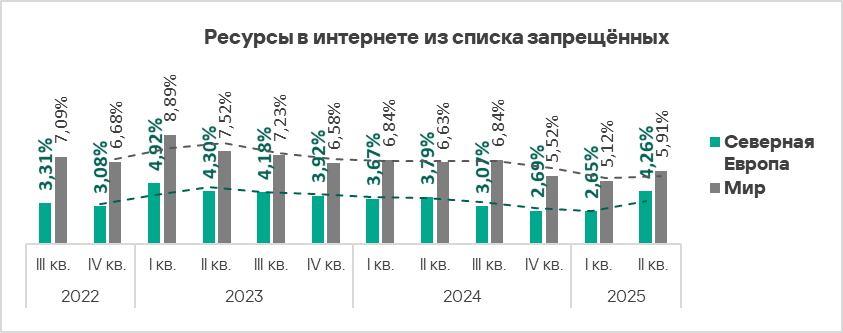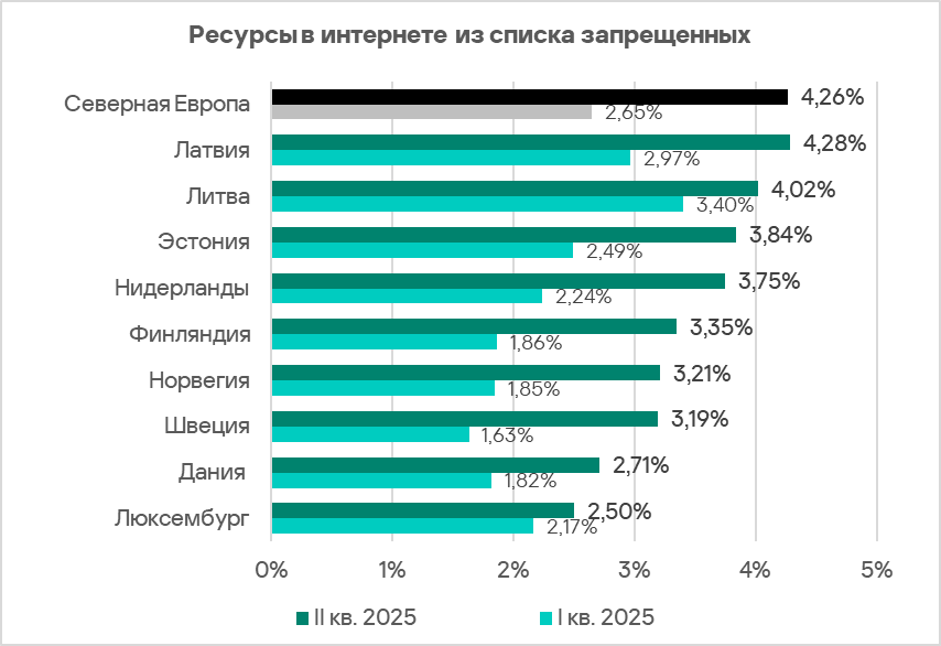 Во втором квартале 2025 года Северная Европа лидирует среди регионов по росту доли компьютеров АСУ, на которых блокировались ресурсы в интернете из списка запрещенных.